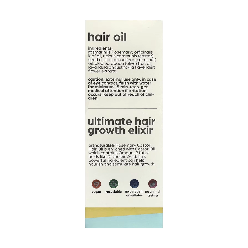 Касторовое масло для волос с розмарином artnaturals® обогащено касторовым маслом, которое содержит омега-9 жирные кислоты, такие как рицинолевая кислота. Этот мощный ингредиент питает и стимулирует рост волос.