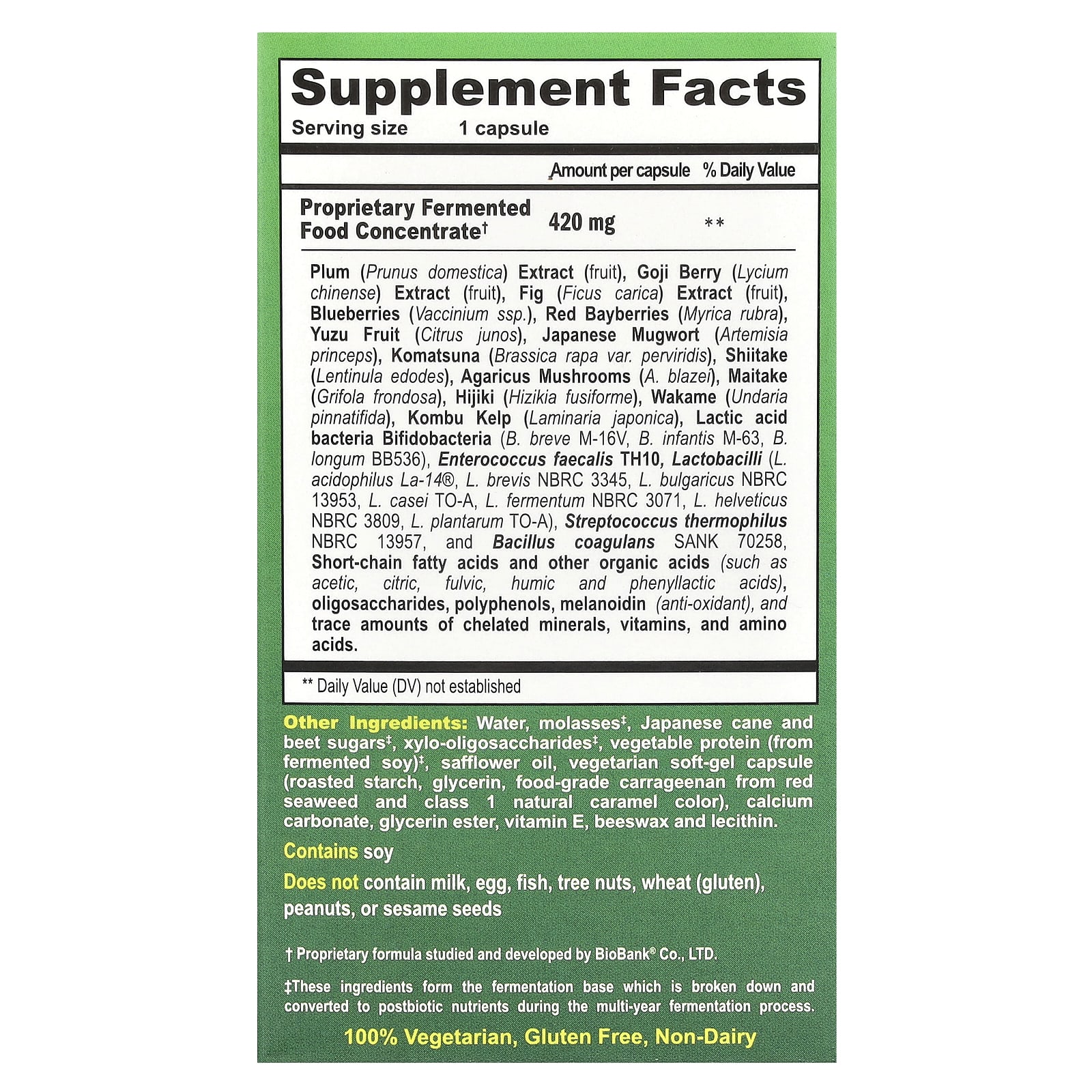| Экстракт сливы (Prunus domestica) (плоды), экстракт ягод годжи (Lycium chinense) (плоды), экстракт инжира (Ficus carica) (плоды), голубики (Vaccinium ssp.), Красной брусники (Myrica rubra), плодов юдзу (Citrus junos). ), Полынь японская (Artemisia princeps), комацуна (Brassica rapa var. Perviridis), шиитаке (Lentinula edodes), грибы агарик (A. blazei), майтаке (Grifola frondosa), хидзики (Hizikia fusiforme), вакаметифида (Undnatifida). Водоросли комбу (Laminaria japonica), молочнокислые бактерии бифидобактерии (B. breve M-16V, B. infantis M-63, B. longum BB536), Enterococcus faecalis TH10, лактобактерии (L. acidophilus La-14®, L. brevis NBRC 3345, L. bulgaricus NBRC 13953, L. casei TO-A, L. fermentum NBRC 3071, L. helveticus NBRC 3809, L. plantarum TO-A), Streptococcus thermophilus NBRC 13957 и Bacillus coagulans SANK 70258, короткоцепочечный жирный кислоты и другие органические кислоты (например, уксусная, лимонная, фульвовая, гуминовая и фенилмолочная кислоты), олигосахариды, полифенолы, меланоидин (антиоксидант), следовые количества хелатных минералов, витаминов и микроэлементов хелатных минералов, витаминов и аминокислот. | ||